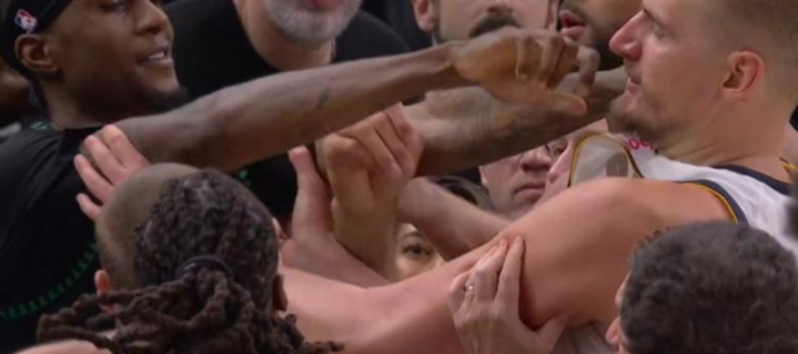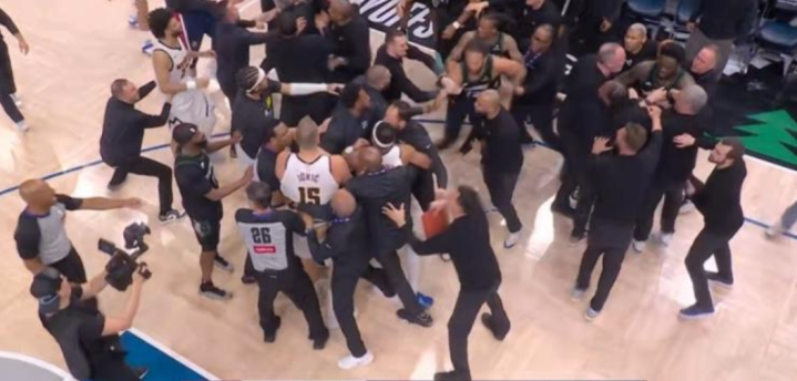 比赛尾声,赢输已定的情况下,丛林狼球员麦克丹尼尔斯在无东说念主细心时上篮,激愤了心态失衡的约基奇,后者主动向前与其撕扯,激励两边球员大规模打破,最终约基奇和麦克丹尼尔斯双双被隔断离场。